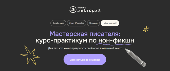 Если тема «назрела», а хочется плеча рядом: 27 октября у «Альпины» стартуют камерные писательские мастерские — про структуру, голос и аккуратную редактуру. Для тех, кто хочет превратить свой опыт в отличный текст. Программа курса составлена вместе с главными редакторами издательской группы «Альпина».