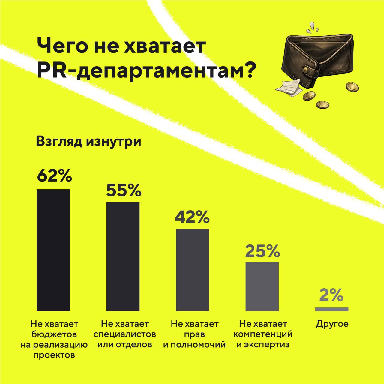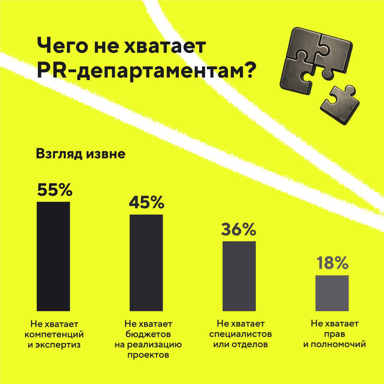 - При этом пиарщики извне считают, что главная проблема PR-департаментов компаний — именно в недостатке компетенций и знаний. Так ответили 55% респондентов в этой группе.
