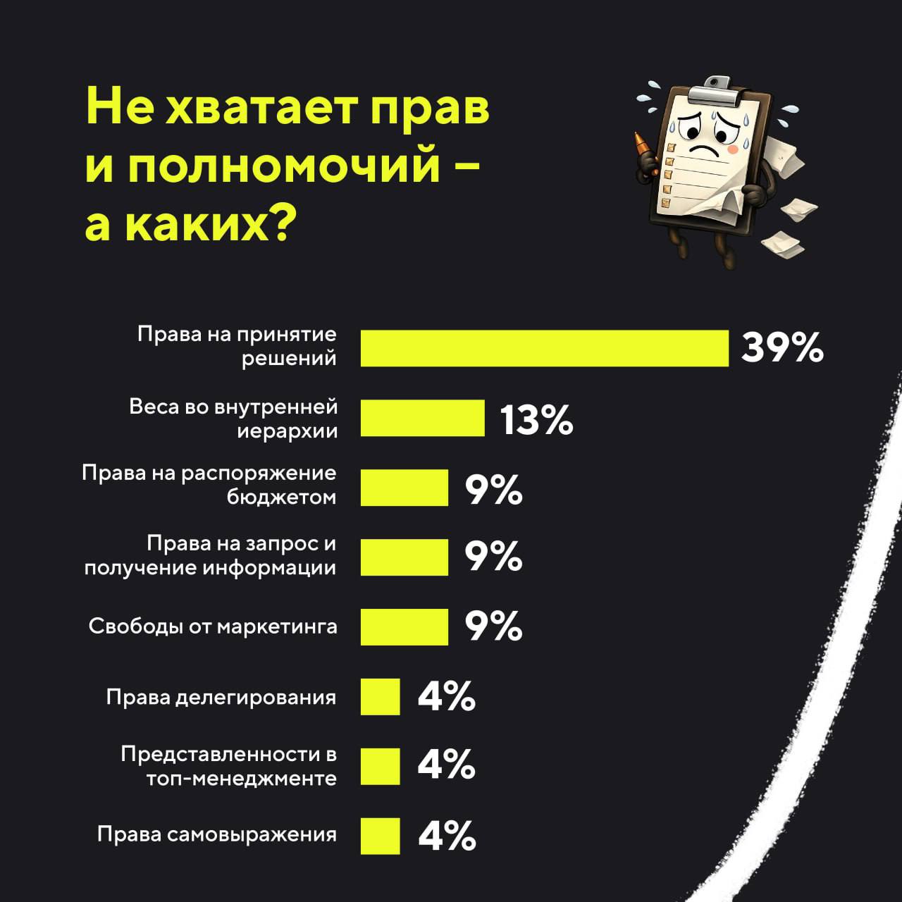 - Если вынести вечную проблему денег за скобки, основные трудности связаны с недостатком кадров (55%) и полномочий (42%) — особенно не хватает прав на самостоятельное принятие решений.